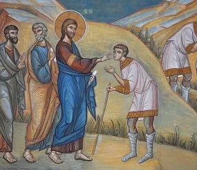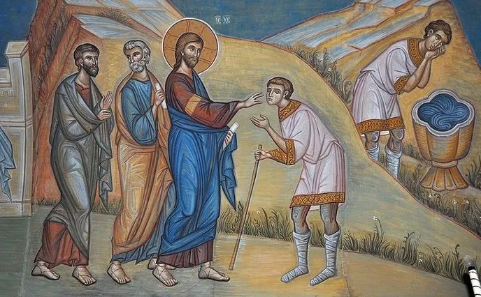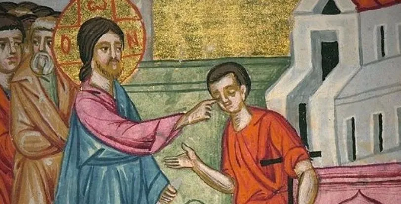 Затем Господь исцелил этого человека, чем вызвал гнев фарисеев1, ибо совершил это в день покоя — субботу. Фарисеи допрашивали исцелённого, говоря, что не знают кто есть и откуда пришёл исцеливший его. На что бывший слепым, а теперь прозревший отвечал: