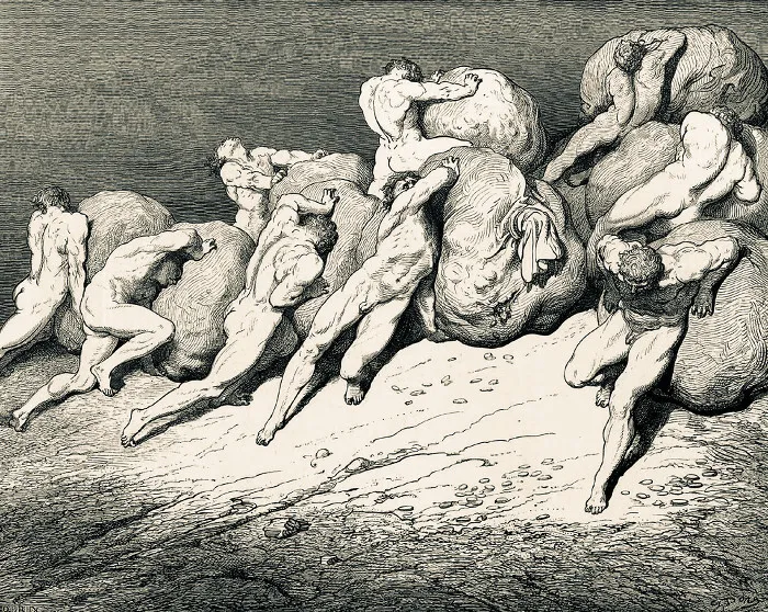 Хорошей иллюстрацией к вышесказанному может послужить гравюра Гюстава Доре из серии «Ад» к «Божественной комедии» Данте, где предельно напряжённые обнажённые «сизифы» безрадостно толкают свои «камни» — округлые мешки, вероятно, с грехами и проблемами; каждый — сам по себе и сам на сам со своим бременем. Они словно не видят друг друга, их друг для друга словно не существует.