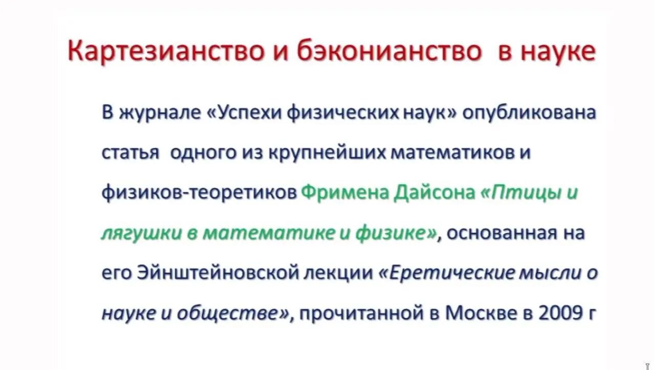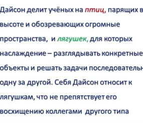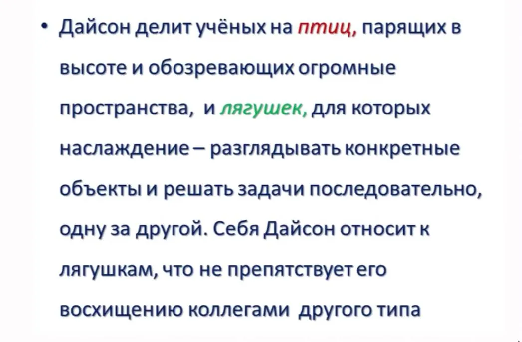 Собственно на «лягушек» и «птиц» разделил учёных американский физик-теоретик Фримен Дайсон, себя причислявший к лягушкам. Первые по его мысли приспособлены разглядывать конкретные детали и последовательно решать задачи одну за другой. Вторые (т. е. птицы) — парят высоко в небе и обозревают с высоты огромные пространства, достигая прозрений.