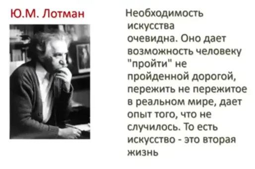«Искусство — это способность передать опыт, которого человек не имеет. Искусство возникает как вещь, которая даёт возможность получить опыт тому, кто этот опыт получить в принципе не может, поэтому оно возникает при культе. Потому что достаточно мало людей, которые могут вступить в прямое мистическое отношение. Или достаточно мало людей, которые склонны произвести с собой все те вещи, которые нужны для того, чтобы было возможно вступить в это мистическое отношение. Поэтому искусство изначально выступает как способ передачи опыта, который доступен немногим, — всем». Филология — принципиально соборная наука. Мы все видим предмет в некоем ракурсе. То есть, одному все не доступно. Это единство, где каждый может увидеть нечто, абсолютно не доступное другим.