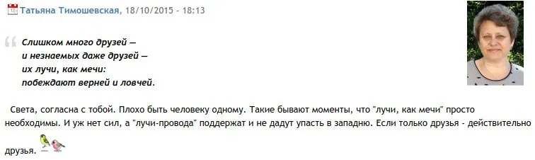 *«Как-то раз подруга наблюдала, как за одиноким воробышком погнался то ли коршун, то ли другой пернатый хищник (он остался неопознанным). Казалось, беда вот-вот настигнет незадачливую птичку, как вдруг неизвестно откуда в небе появился огромный шар — собравшиеся в большую стаю крохотные воробьи. Этот «шар» поглотил выбившегося из сил сородича, и тем спас его от неминуемой гибели. Хищник был вынужден отступить» (С. Коппел-Ковтун «Несколько слов о кризисе идентичности»)