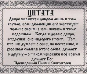 «Мир полон дремлющей любви. Счастлив тот, в ком она проснётся и кто сумеет не упустить её, не опошлить, а сохранить живой. Тот несёт в себе источник внутреннего блаженства и око духовного откровения; счастье, чтобы осчастливить людей; свет, чтобы светить другим; вечный поток и вечную песню...А если эта любовь к другому человеку и не находит ответа, тогда ей ещё надо очиститься, до полного самоотречения» (Иван Ильин. Я вглядываюсь в жизнь).