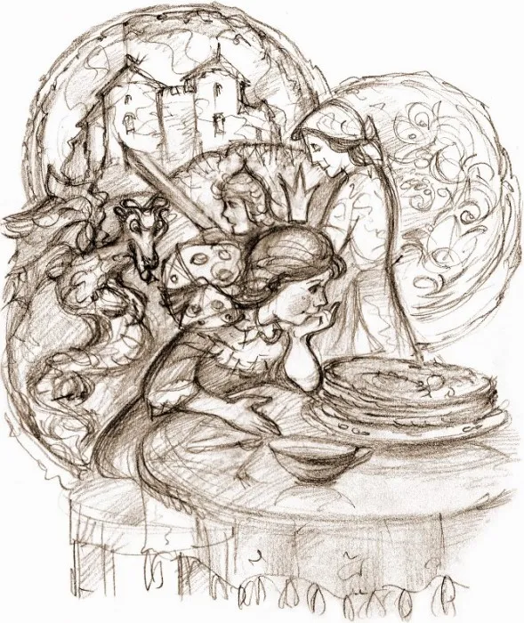 Вот кладёт мама готовый блин, поливает его маслицем, а Кася всматривается в его поверхность, как в лист бумаги, чтобы как можно скорее понять, что изображено на нём. И всякий раз новый сказочный образ угадывается: то замок заколдованный видится, то принцесса, а то дракон крылатый, который хочет похитить красавицу принцессу, чтобы жениться на ней. А вот волшебная птичка из Касиной сказки, которая поёт ей волшебные песни. А ещё — лев гривастый, защитник волшебного замка. И рыцарь сказочный на коне скачет. И цветы сказочные распускаются…