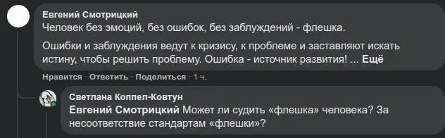 Светлана Коппел-Ковтун: Не хотят уподобить, а уже уподобили. И многие с радостью сбросили с себя бремя человечности - это удобно, никаких моральных заморочек. Тупое следование тупым инструкциям стало чем-то вроде рая - внутренне комфортное состояние. Бремя ответственности за то, что ты недостаточно хороший или даже плохой или даже слишком плохой - сброшено. И это облегчение человек ощущает как свою свободу и даже значимость (у него есть пусть маленькое право не пущать, отказывать, наказывать, запрещать, преследовать и пр.). «То есть человек отныне якобы должен быть объясним словно какой-нибудь сложный механический аппарат» - нет, не сложный. Очень примитивный.