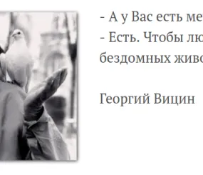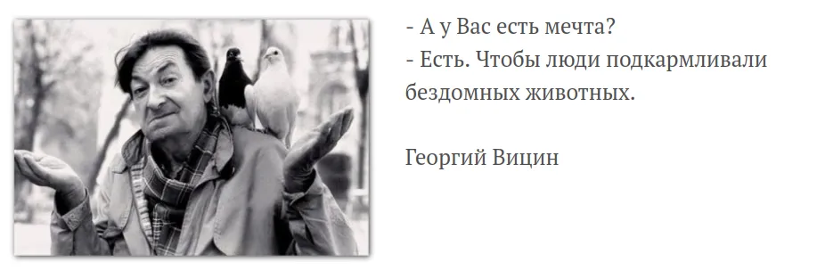Стоит вспомнить слова св. Алипии, что тот, кто кормит животных, никогда не умрёт от голода. Как это не похоже на ханжеское высмеивание самоотверженных кормильцев братьев наших меньших. И очень похоже на притчи о взаимосвязи человека и животных, которых много у разных народов. Например такая: «Голубка прилетела к Будде, скрываясь от тигрицы, и Будда ее укрыл. Но к нему прибежала и тигрица, сказав: "Не я создала себя такой как есть, – питающейся мясом. Ты укрыл голубку. Скажи, чем мне кормить своих тигрят?" Тогда Будда отрезал кусок собственного тела и положил на одну чашу весов. На другую – голубку. Голубка перевешивала. Сколько бы кусков тела ни клал на весы Будда, голубка перевешивала. Тогда Будда сам встал на весы и весы уравновесились».