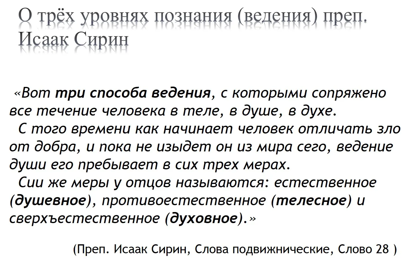 Иначе говоря, не столь важно, что человек делает, важнее из какого своего центра он это делает: самостного (ветхого) или духовного во Христе. Правильность дела определяется именно этим показателем, ибо центр определяет и смысл, и конечный результат действия.