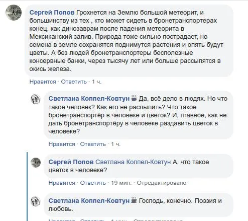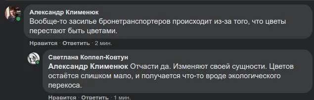 Некоторые люди выбирают железо и мощь, другие - цветение и свободу. Первые лишены бонусов вторых, а вторые - бонусов первых. Но вторые не завидуют судьбе первых, они любят нечто противное тупой железной силе, которая ненавидит всё, что ей не подчиняется. Но разве может цветок подчиниться бронетранспортёру? По природе вещей не может - цветок от него совершенно отчуждён. Кроме одного случая - когда бронетранспортёр давит цветок и уничтожает его бытие (таково железное прикосновение к живому цветению - иное невозможно). Другого способа у бронетранспортёра повлиять на цветение цветка не существует. Более того, бронетраспортёр может позавидовать цветку, потому что в цветке есть жизнь, недоступная бронетранспортёру.