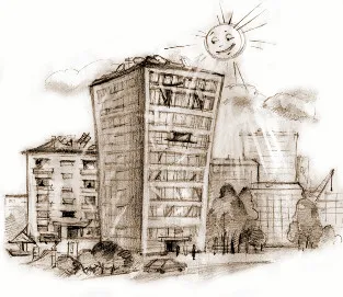 Трехэтажка, увидев, что Пятиэтажке нет до нее никакого дела, загрустила и начала разрушаться: дверной косяк покосился, краска стала отшелушиваться, окна потускнели…
