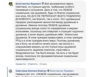 Не стоит забывать, что душевное всегда прежде духовного, и духовное — это не бездушное, не внедушевное, а сверхдушевное, наддушевное (надстройка, которая над постройкой, а не без неё).