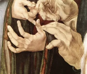 Это произведение Альбрехт Дюрер написал всего лишь за 5 дней, во время пребывания в Венеции. Перед нами Христос, беседующий с книжниками. Каждый из мудрецов воспринимает новые слова индивидуально: ученый слева, закрывший книгу, внимает новой для себя истине, не сожалея о прошлых воззрениях. Справа от него - книжник с длинной бородой, горестно смотря вдаль с раскрытой книгой, выказывая своим взглядом о крушении идеалов, нехотя признавая правоту Христа. Книжники вверху являют противоположное мнение, но с разным подходом. Так, ученый слева ищет опровержение в книге, а книжник напротив - ведет прямой спор с Христом, о чем указывают жесты ( в этом произведении Дюрер вообще зациклил внимание на жестах). И на заднем плане - зрители всей этой сцены, я бы сказал - отображение нас самих. Эта картина показывает человечество, его полное различие, разность восприятий и подходов.