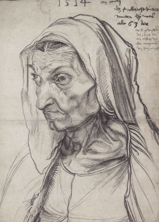 Выполненное углем изображение 63-летней женщины передает очень многое: и уважение, и грусть от скорого прощания. К моменту написания картины мать художника, родившая 18 детей, из которых выжили только трое, была очень больна. Как написал о ней Дюрер, ей пришлось пройти через бедность, насмешки, пренебрежение, презрительные слова, страх, но она не стала мстительной:
