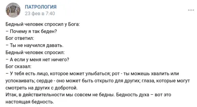 Сама притча - вполне нормальная, если убрать приписку «Итак, в действительности мы совсем не бедны. Бедность духа – вот это настоящая бедность». Выделенное меня возмутило. Ниже следует моя переписка с вероятным админом группы: