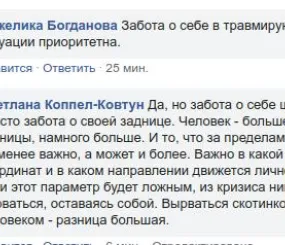 Мой ответ: Да, но забота о себе шире, чем просто забота о своей заднице. Человек - больше своей задницы, намного больше. И то, что за пределами жопы - не менее важно, а может и более. Важно в какой системе координат и в каком направлении движется личность, ибо если этот параметр будет ложным, из кризиса никогда не вырваться, оставаясь собой. Вырваться скотинкой или человеком - разница большая.