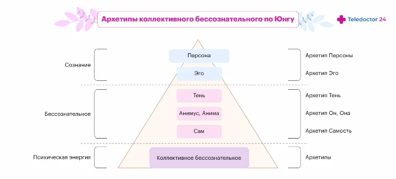 Коллективное бессознательное по Юнгу выражается через архетипы (модель мышления, поведения, которая есть у каждого человека и унаследована от предков). Он считал, что архетипы могут изменяться, сочетаться. Для объяснения бессознательного, Юнг использовал следующие архетипы: