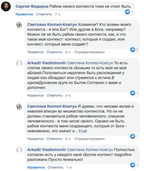 Arkadii Vladimlrovih: То есть, слитие своего контекста с Божьим, то есть мой - не мой, а Божий. Получаеться не должно быть расхождений у людей, кои обладают или стремятся к истине.В одном Духовном круге их Бытие.Согласен с вами и дополнил.