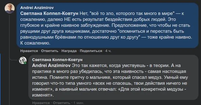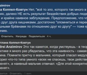 А что если Бог создал мир таким образом, что для каждой беды человеческой есть своё решение в лице того или иного человека, индивида, личности? Отсюда понятной становится роль личности в истории - она бывает решающей. Быть может всё то зло, которого так много в мире - всего лишь результат бездействия добрых людей, кому следовало что-то предпринять на определенном этапе жизни, столкнувшись с той или иной проблемой, несправедливостью, столкнувшись со злом - маленьким, посильным для человека. Что если зло, которое губит человечество - всего лишь результат не сделанных добрых, вполне конкретных, поступков? Тогда надо опомниться и перестать быть равнодушными брёвнами по отношению друг ко другу - чтобы не стать рвущими друг друга хищниками.
