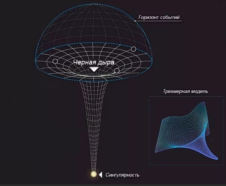 Кроме горизонта событий чёрные дыры обладают такой характеристикой, как сингулярность — которая является центром чёрной дыры. В точке сингулярности достигается максимальная масса, плотность и гравитация. В чёрных дырах искривляется ткань пространства-времени и перестают работать все известные законы физики.
