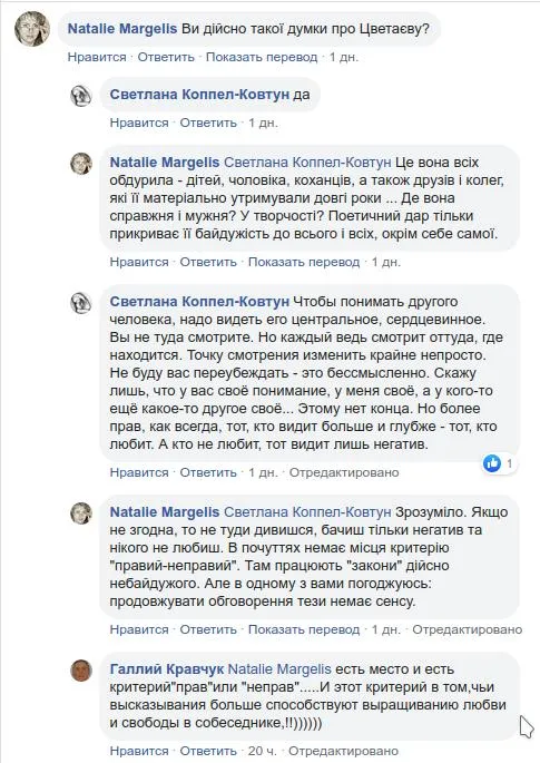 Цветаева считала, что её не обманули только Рильке и Пастернак. В каком смысле не обманули? В смысле явили человека — подлинного, внутреннего, а не внешнего (всегда боязливого и неверного). Рядом можно поставить другое её высказывание: «я всех мужчин превращаю в женщин». Оно о том, что она всегда гораздо мужественнее, и рядом с ней быть мужественным непросто. Почему? Потому что она действительно мужественна, по-настоящему, а не понарошку или напоказ, как принято в мире людей. Она вообще — настоящая, ибо к каждому подходит «вся». Она - поэт всегда, в этом её юродство и сиротство.
