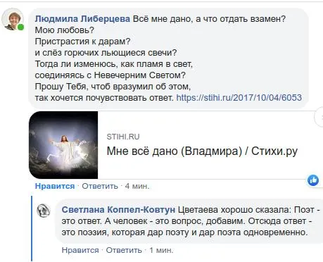 Цветаева хорошо сказала: Поэт - это ответ. А человек - это вопрос (П.Тиллих), добавим. Отсюда ответ - это поэзия, которая дар поэту и дар поэта одновременно.