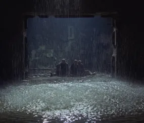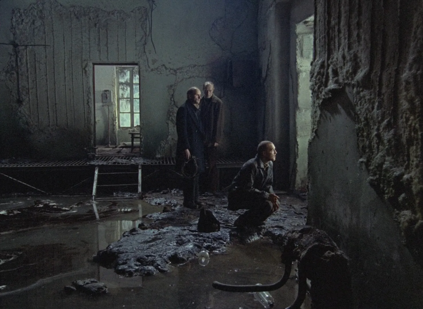Споткнувшись, Писатель чуть не падает через порог в Комнату, но Сталкер его удерживает.