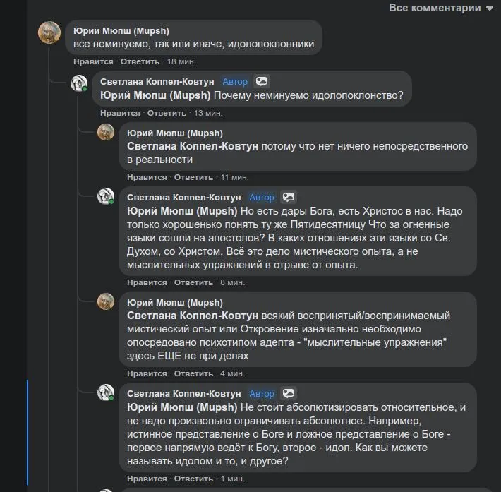 Мой ответ: Но есть дары Бога, есть Христос в нас. Надо только хорошенько понять ту же Пятидесятницу Что за огненные языки сошли на апостолов? В каких отношениях эти языки со Св. Духом, со Христом. Всё это дело мистического опыта, а не мыслительных упражнений в отрыве от опыта.