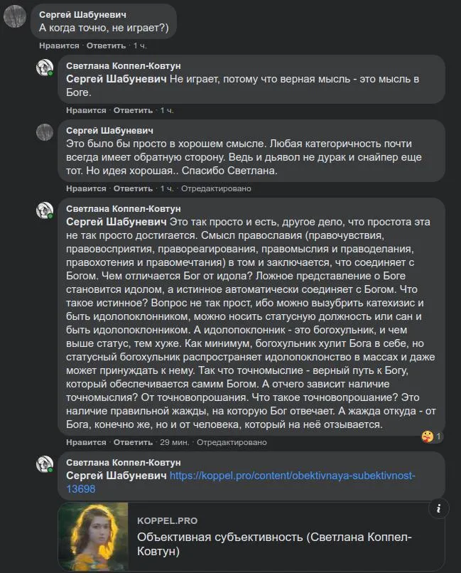 Вопрос: Говорю не о представлениях, а о изначальном восприятии. Любопытно по каким критериям Вы отличаете истинные представления о Боге от ложных? Всякая интерпретация по определению ограничена.