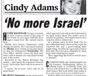 New York Times, 17 сентября 2012 года: «Adams in her column posted Sept. 17 wrote that “Reported to me, Henry Kissinger has stated — and I quote the statement word for word: ‘In 10 years, there will be no more Israel».