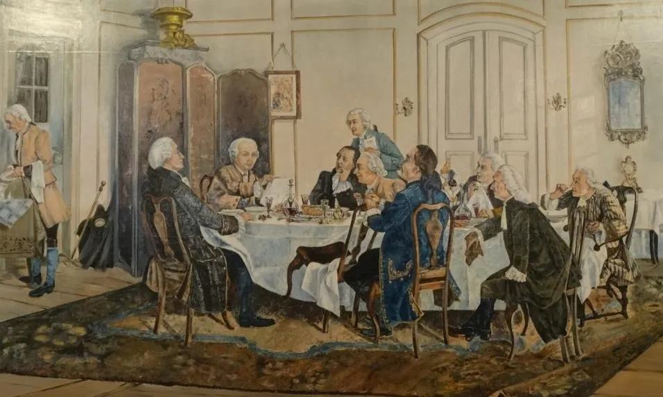 Кант обедал раз в день - в течение нескольких часов (с часу до четырех или пяти часов). Должны были присутствовать не менее трёх и не больше десяти человек. Среди них должны были быть и дамы. Беседы строились по типу перемены блюд. В начале был суп, и это было время историй. Главное блюдо сопровождалось рассуждениями. Рассказав историю, люди начинали спорить, и тогда уже нужно подавать вино. И спор должен быть таким, чтобы человек с другим мнением воспринимался благожелательно. Когда второе блюдо съедено, вино выпито, и спор дошёл до апогея, подаётся десерт. И тогда приходит время шуток. Здесь подключаются и дамы. Все шутят, и это способствует перевариванию пищи.