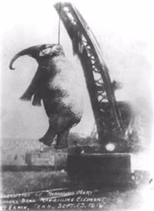 Казнь слона. В начале 20 века в США состоялось несколько казней слонов. Например, 1916 году слониху по имени Большая Мэри за то, что она раздавила трёх человек, после нескольких неудачных попыток застрелить казнили через повешение на подъёмном кране.