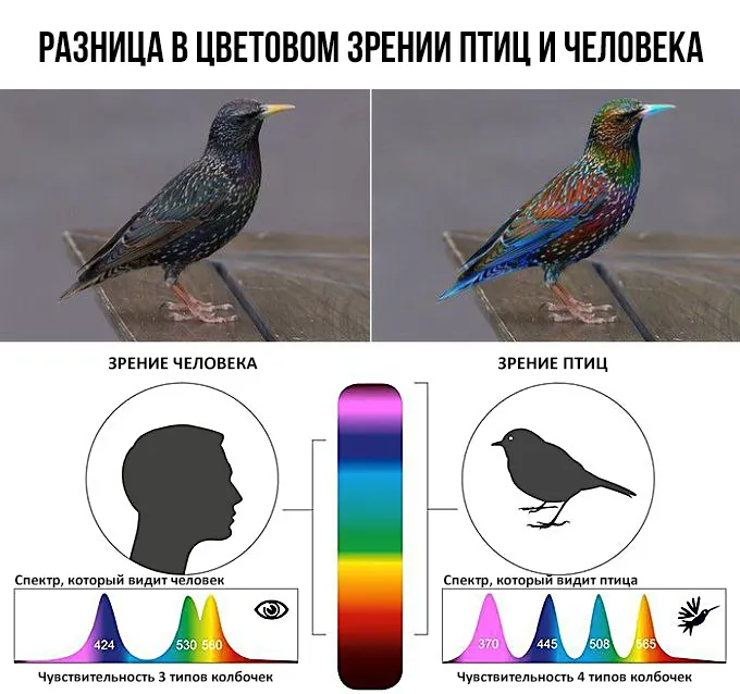 Люди и птицы видят мир по-разному, и рисунок наглядно показывает, насколько сильно отличается наше зрение. Человеческий глаз использует три типа колбочек, которые воспринимают синий, зелёный и красный диапазоны света. Их чувствительность отражена на графике с пиками примерно на 424, 530 и 560 нанометрах. Поэтому наш видимый спектр ограничен: мы различаем множество оттенков, но не видим ничего за пределами обычной радуги, включая ультрафиолет. Именно так мы воспринимаем, например, скворца на фото слева — тёмным, слегка переливающимся, но без ярких скрытых особенностей.