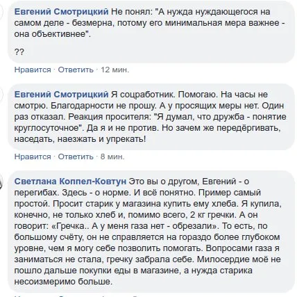 Наше доброделание, как правило, спотыкается о различие минимумов дающих и берущих (нуждающихся). Минимум нуждающегося зачастую больше, чем минимум дающего, чем тот минимум, на который он решился и рассчитывает. В этом есть что-то закономерное, требующее усилия восходить из меры в меру. Дающий должен быть готов дать больше, чтобы отщипнуть от своего эгоизма хоть чуток. А нужда нуждающегося на самом деле - безмерна, потому его минимальная мера важнее - она объективнее. Не говоря о том, что силы человека, пребывающего в лишениях и человека, живущего привычной жизнью - неравны, запас прочности у первого, явно, ограничен (он - под ударом).