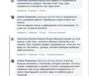 Мой ответ: Когда обезьяна спасает из огня щенка, у неё тоже — инстинкт (Жизнь!). Могла бы и не спасать. Или, подобно людям, порадоваться — хотя нет, это вряд ли. Инстинкты — разные, человек свободен выбирать себе инстинкты.