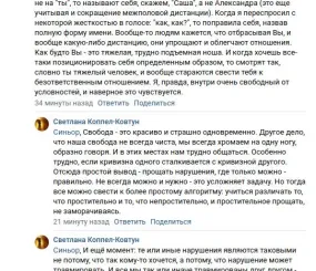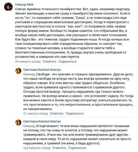 Свобода - это красиво и страшно одновременно. Однако наша свобода не всегда чиста, мы обычно хромаем на одну ногу - образно говоря. И в этих местах кривизн нам трудно общаться. Особенно трудно, если кривизна одного сталкивается с кривизной другого. Отсюда простой вывод - прощать нарушения, где только можно - правильно. Не всегда можно и нужно - это усложняет задачу. Но тогда все можно свести к более простому алгоритму: учиться различать то, что простительно и то, что непростительно, и простительное прощать, не заморачиваясь.