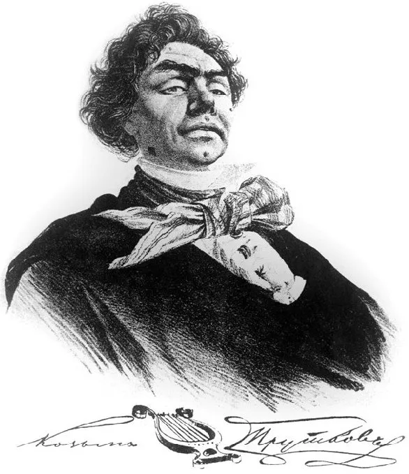 Вымышленный «портрет» Пруткова, созданный Львом Михайловичем Жемчужниковым, Александром Егоровичем Бейдеманом и Львом Феликсовичем Лагорио