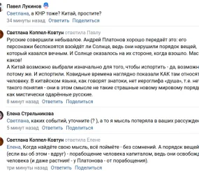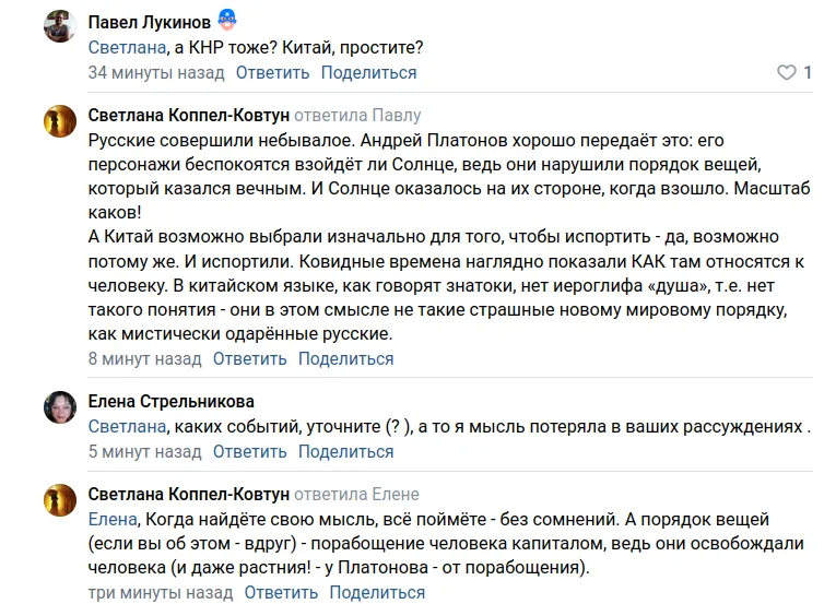 Светлана Коппел-Ковтун: Русские совершили небывалое. Андрей Платонов хорошо передаёт это: его персонажи беспокоятся взойдёт ли Солнце, ведь они нарушили порядок вещей, который казался вечным. И Солнце оказалось на их стороне, когда взошло. Масштаб каков!