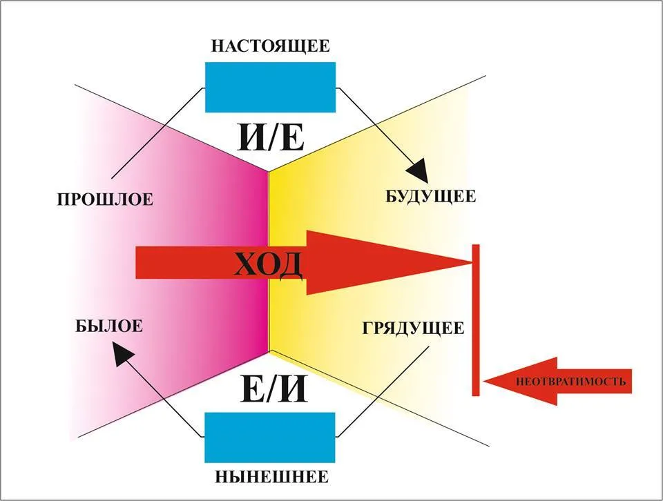 - Если исходить из трех базовых характеристик времени. Длительность-продолжительность и "потоковости",то "прямое" время от прошлого через настоящее к будущему в "Естественном"-прогнозируется,а в "Искусственном"-проектируется. В "обратном" ( из грядущего через нынешнее к бывшему) времени-"Естественное"-предвосхищается (похищение грядущего),а "Искусственное"- сценарируется. Как там в песне: " Было и прошло,твердит мне время...". Еще "терминируют" время как хрональное,темпоральное и таймированное. В мифологии-Хронос (пожирающий), Кайрос.....Лета-река времен и прочее. Российское историческое время "задето" дефектом-маятником: возвратно-поступательного движения. Чередования ярого "самодержавия" с вальяжным либерализмом. Климат холодный. Поэтому "зима"-"оттепель" и снова колотун. А в схеме принцип необратимости, которым еще придется овладеть для "не возвращения" ко временам ......Но изображенная на схеме "машина времени" вполне практично работает..