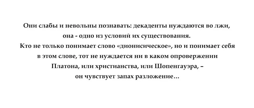 Его существование пришло в упадок в том же году, что и мое: в тридцать шесть лет я опустился до самого низшего предела своей витальности - я еще жил, но не видел на расстоянии трех шагов впереди себя. В то время - это было в 1879 году - я покинул профессуру в Базеле, прожил летом как тень в Санкт-Морице, а следующую зиму, самую бедную солнцем зиму моей жизни, провел как тень в