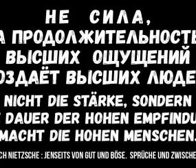 «Сильнее и удивительнее всего сила воли проявляется в громадном срединном царстве, где Европа как бы возвращается в Азию – России. Там сила хотеть давно уже откладывалась и накоплялась, там воля ждёт – неизвестно, воля отрицания или воля утверждения, - ждёт угрожающим образом того, чтобы, по любимому выражению нынешних физиков, освободиться».