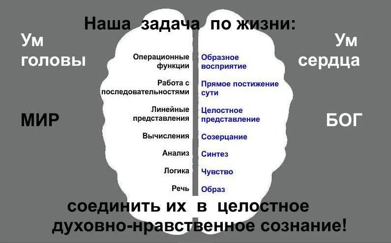 Правосторонним рациональным мышлением человек охватывает внешний мир через науку, научные знания и научную психологию, а левосторонним сознанием сердца человек охватывает внутренний мир через религию, духовное знание и учение святых отцов церкви о душе.