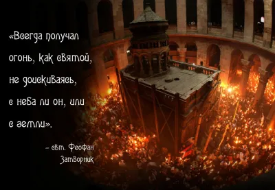 Свт. Феофан, который в составе Русской духовной миссии несколько лет провел в Иерусалиме (весной и летом 1848 г. - он жил при монастыре Гроба Господня) - подчеркивает святость огня независимо от его происхождения, о котором советует не доискиваться. В то же время он указывает на свидетельства, которые располагают верить в возможность чуда, хотя и не воспринимает вопрос о происхождении благодатного огня как принципиальный.