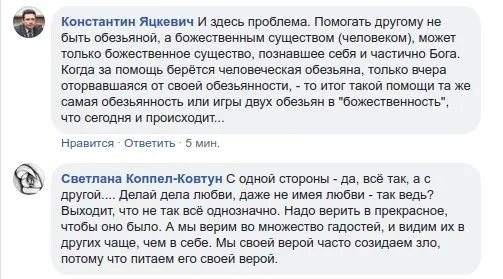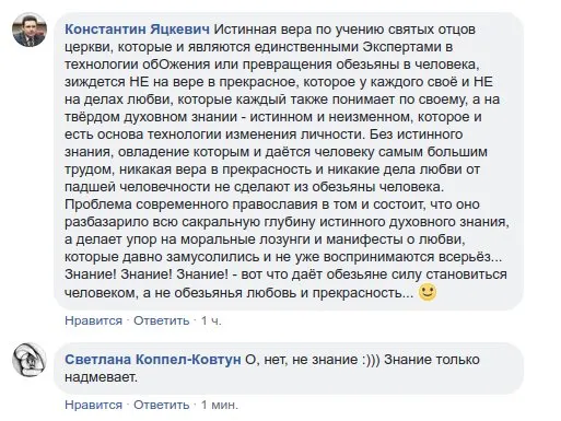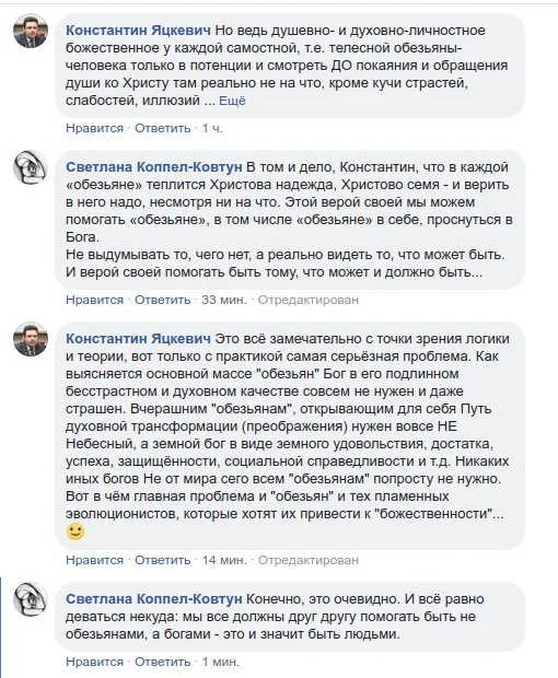 В каждой «обезьяне» теплится Христова надежда, Христово семя - и верить в него надо, несмотря ни на что. Этой верой своей мы можем помогать «обезьяне», в том числе «обезьяне» в себе, проснуться в Бога.