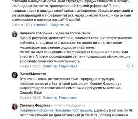 Двуприродная референциальность имеется и в реальном диалоге. Логика здесь примерно следующая. Предикат принято понимать в обобщенном смысле как то, что не идентифицирует (именует), а описывает референт, как то, следовательно, что может утверждаться (или – что сохраняется при отрицании, но здесь нет нужды касаться сложных логических дистинкций; для наших целей достаточно самого общего представления о предикате). Каждая реплика диалога, несомненно, содержит некое утверждение и в этом смысле является предикативным актом. Поскольку же каждая реплика, помимо общего для диалога предмета обсуждения, так или иначе что-то утверждает, пусть и не прямо, одновременно и о предыдущей реплике, постольку ее можно понимать как содержащую предикат в том числе и по отношению к этой предыдущей реплике, которая в свою очередь тоже содержит предикаты, то есть является предикативным актом. Следовательно, в какой-то своей части отношения между репликами, то есть диалогические отношения в их бахтинском смысле, аналогичны отношениям между двумя предикативными актами.