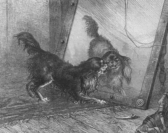 Утром во дворце нашли несчастную собаку мертвой. А ведь она была одна, дворец был пуст, только зеркала окружали ее… миллионы зеркал. Она испугалась своего отражения, она вступила в борьбу со своим отражением. Она погибла в отчаянной борьбе с миллионами своих собственных отражений…