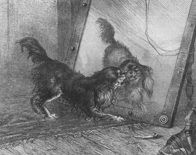Однажды во дворец забежала собака. Озираясь по сторонам, она увидела, как со всех сторон на нее смотрят собаки, множество собак. Собаки были повсюду. Но она была разумной собакой, поэтому просто оскалилась на всякий случай, чтобы испугать их и защитить себя. Окружающие собаки оскалились в ответ. Тогда она зарычала – они ответили ей тем же.