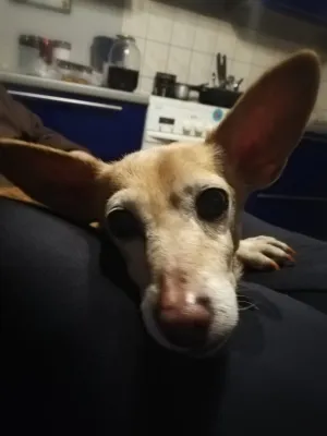 На фото Клёпочка, старенькая собачка, которую нормальные люди больной и старой выкинули из машины на стоянке на Варшавском шоссе, а ненормальные люди подобрали и взяли домой, любить и лечить.