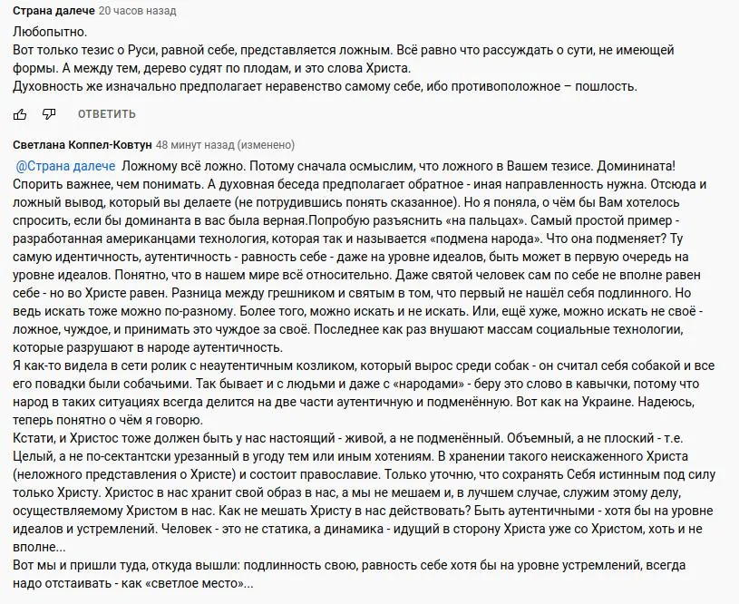 «Русь всегда надо отстаивать» - очень точно сказано! Русь - светлое место, а свет надо постоянно отстаивать: и в себе, и вокруг себя. Светлое место в душе - Господь. Так и про Русь можно сказать: её светлость - Господь, потому пока Русь равна себе, пока она не видоизменена, не подменена в духе времени симулякром, пародией на себя саму, она и есть Русь. А если скомкают все понятия, переврут, перевернут с ног на голову, так её и не станет. Как сказал поэт Н. Зиновьев, «Россия уходит на небо. Попробуй её удержи...»
