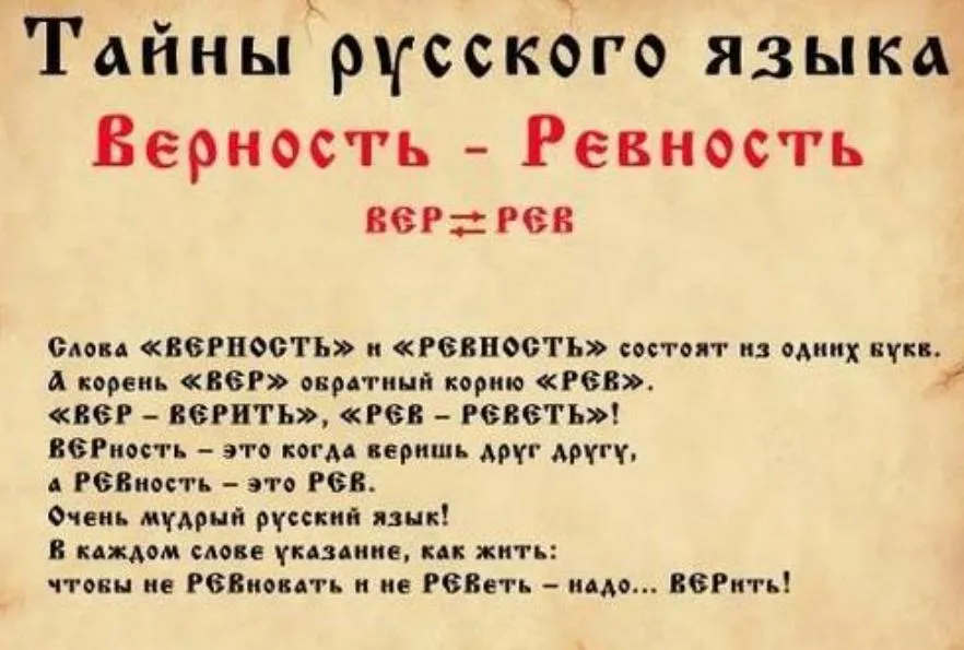 Слова «верность» и «ревность» состоят из одних букв, а корень «вер» обратен корню «рев». Язык подсказывает, что где хранят верность, там не ревнуют и не ревут, где верят, там не ревнуют. Осталось добавить, что верят во Христа, тогда и с верой друг другу, верой друг в друга проблем не бывает.