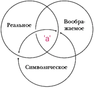 Лакан отмечает область, которая образуется при пересечении всех трех элементов как 'objet petit a' (на схеме 'а'). Буквой 'а' отмечен недостижимый объект желания. Его также называют объектом-причиной желания. Недостижимый объект желания ('а') — это то, что утрачивается субъектом (человеком) в процессе его развития и социализации, то что из него выпадает.