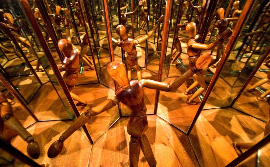 Собака лаяла все громче. Эхо не отставало. Собак а металась туда и сюда, кусая воздух, и ее отражение тоже носилось вокруг, щелкая зубами. Наутро слуги нашли несчастную собаку бездыханной в окружении миллионов отражений издохших собак. В зале не было никого, кто мог бы причинить ей хоть какой-то вред. Собака погибла, сражаясь со своими собственными отражениями».