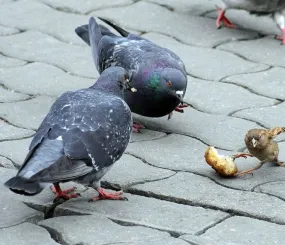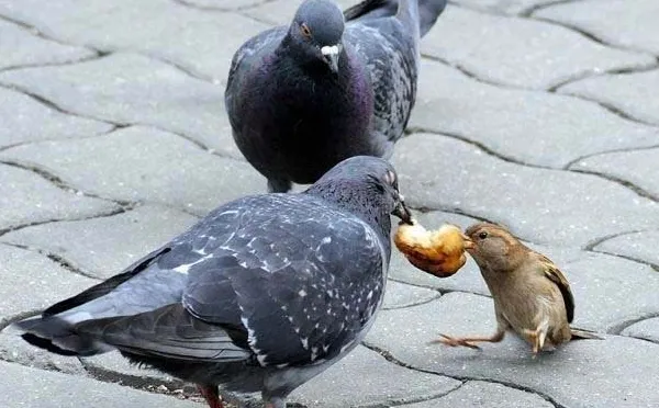 Наблюдая за этим, я поняла, почему голубь - символ мира. У этих птиц словно нет амбиций: стайка голубей никак не отреагировала на то, что пройдоха галка их попросту кинула, они так же передавали оставшийся кусок по кругу, словно раскуривали трубку мира. У голубя отнять еду может даже воробей...